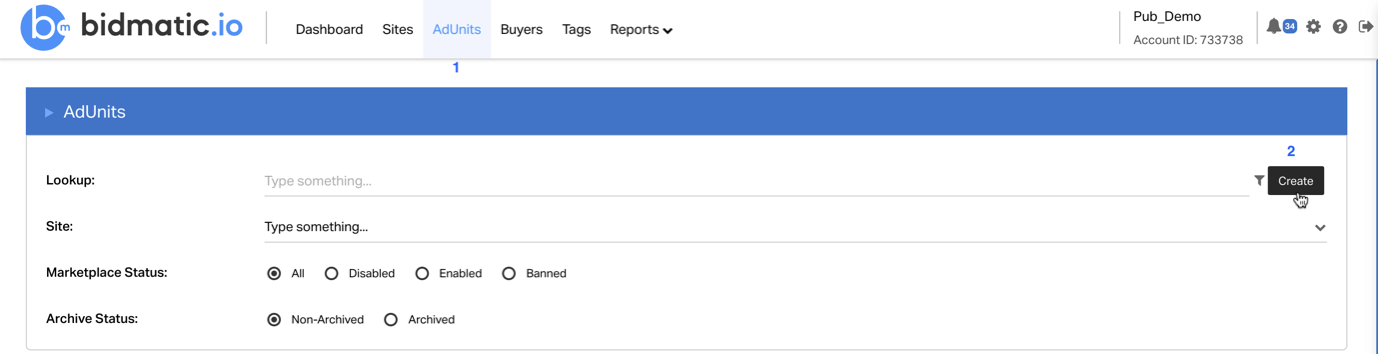 To add a new AdUnit, go to the “AdUnit” tab (1) and click on the “Create” button (2):